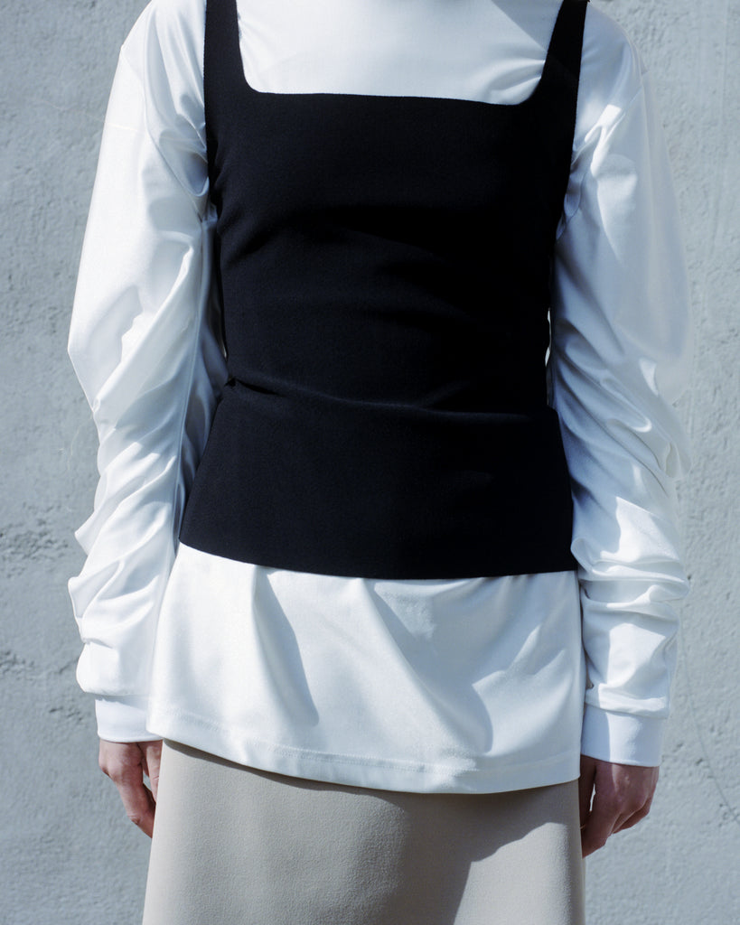 前後どちらを前にしても着用できる2WAY仕様。柔らかなラウンドネックと、シャープなスクエアネックで、気分に合わせた着こなしをお楽しみいただけます。