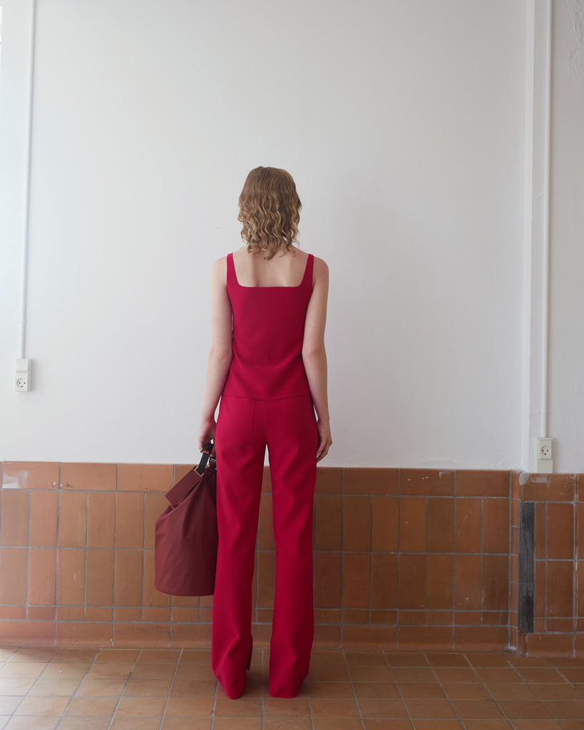 伸縮性の高いポリエステルクレープニット素材のLAY2ノースリーブトップス。クリーンでミニマルなデザインとマットな素材感は、着る人をモダンでエレガントな雰囲気に仕上げてくれます。ストレッチ性が高いので動きやすく、サラっとした肌触りも着心地がよく〇