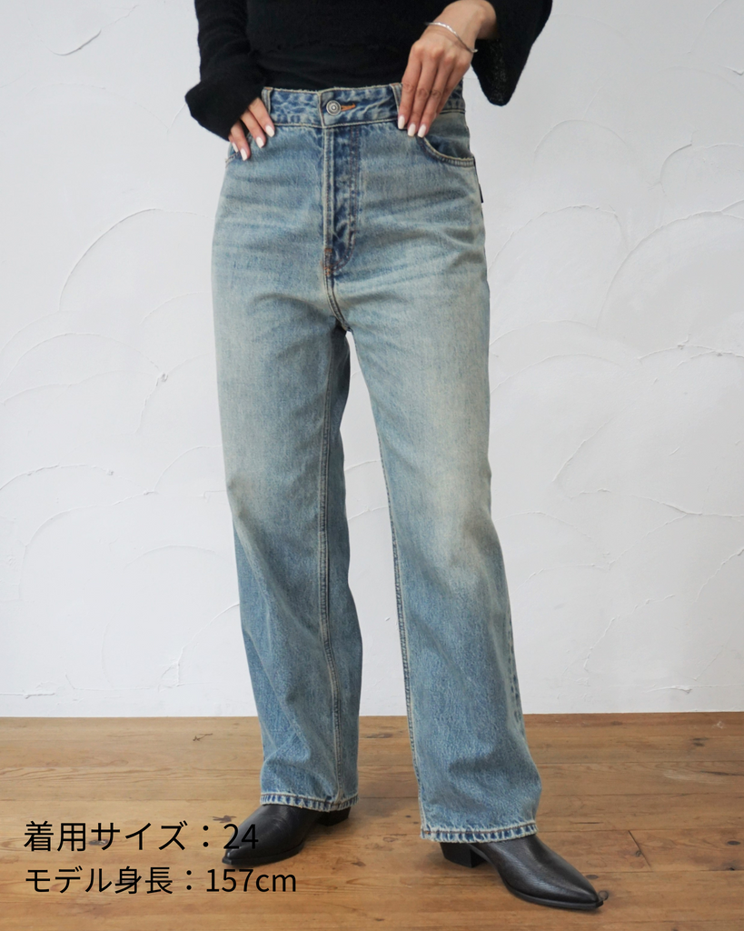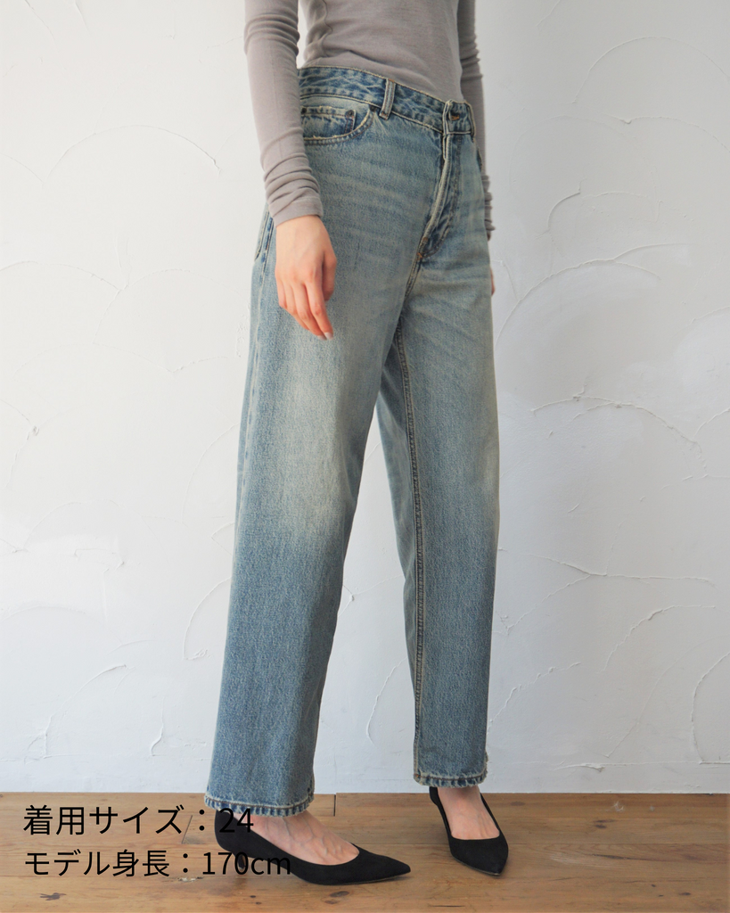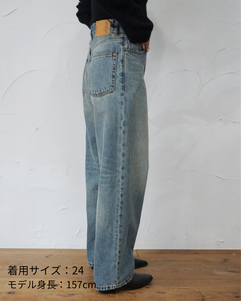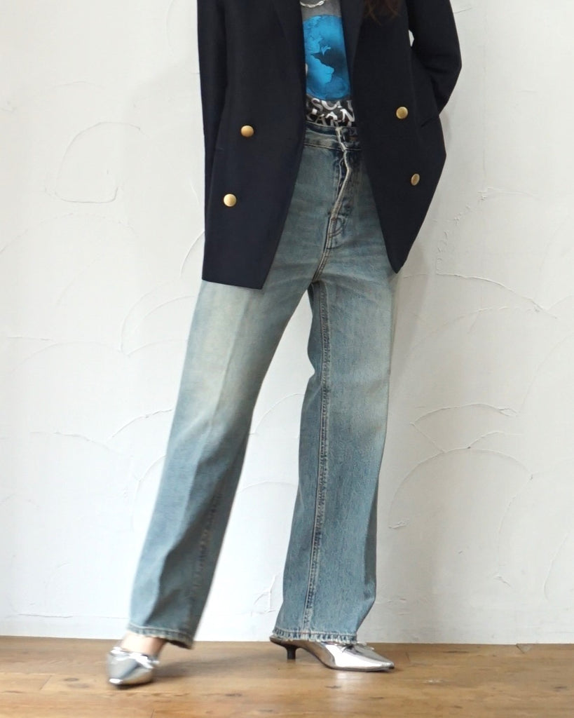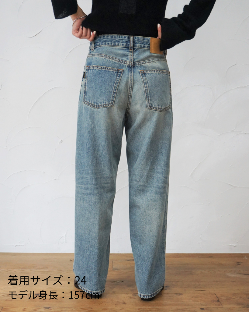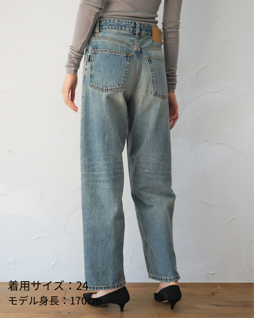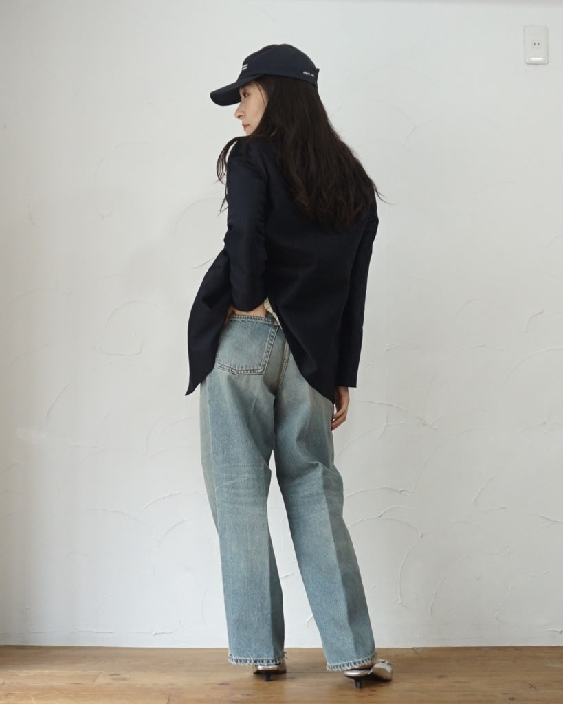 スモーキーなブルーのDIRTY BLUEカラーは明るさと落ち着きを兼ね備えた独特の色合いを持っています。濃色デニムのような引き締まった印象ではなく、柔らかくナチュラルな雰囲気を演出。カジュアルながらも落ち着いた印象を与え、コーディネートに鮮やかさを加えつつも地味になり過ぎないため、幅広いスタイルに合わせやすいです。