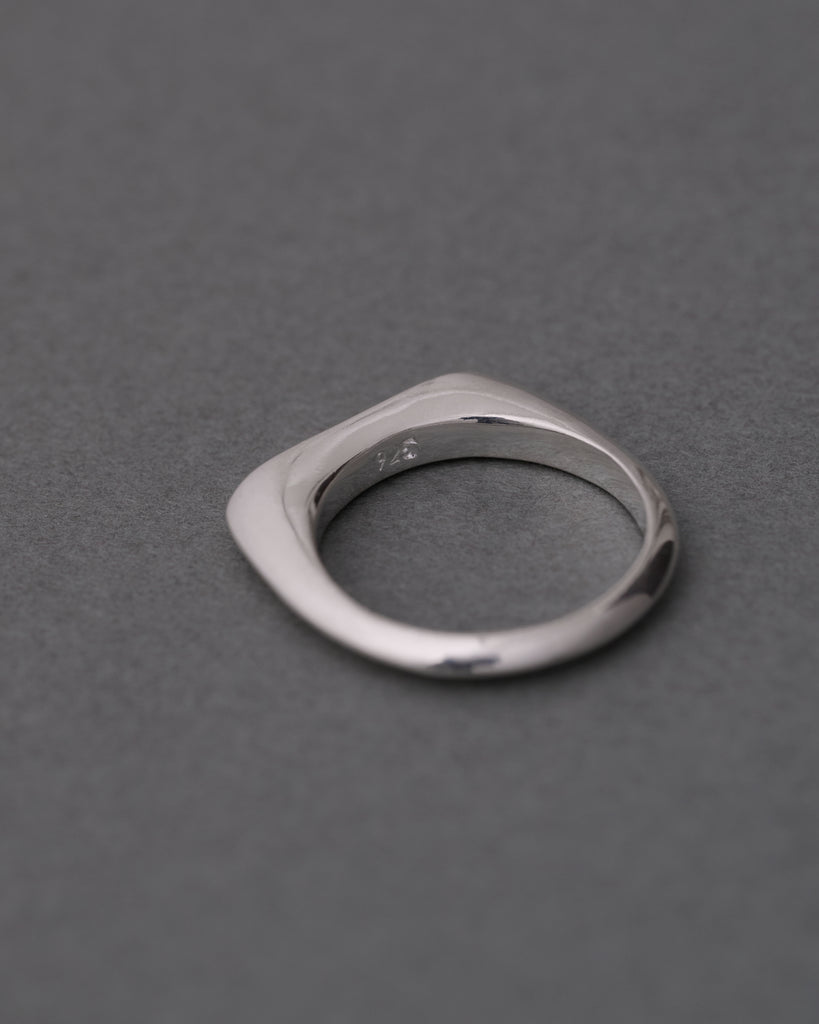 トップにかけてゆるやかな面をもたせた、ミニマルなシルバーリング。角を落とした有機的なフォルムと鏡面仕上げが、手元に控えめな存在感をプラス。