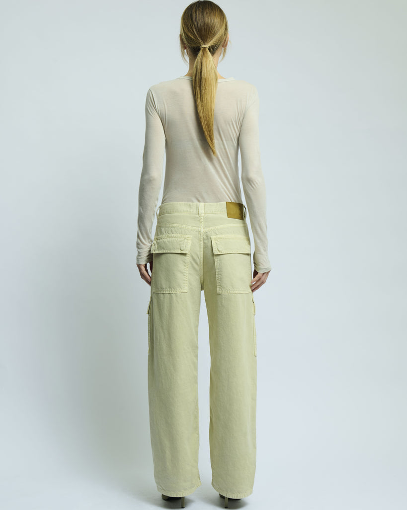 柔らかなライトイエローが春夏のコーディネートに爽やかさをプラスします。サイドやバックに配された大きめのカーゴポケットがデザインのアクセントになり、実用性も抜群。