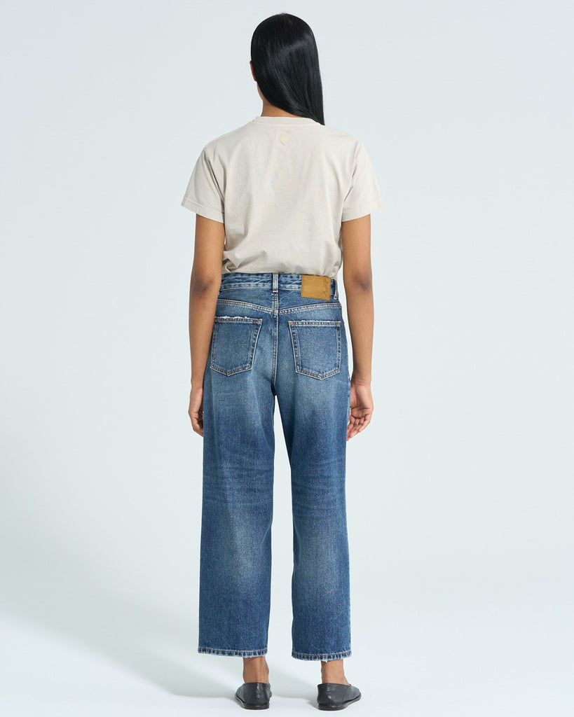 太ももはゆったりしていますが、ヒップは程よくフィットし、裾にかけてテーパードになったきれいなシルエットが特徴です。ヴィンテージ感漂う濃いめのインディゴカラーは、フロントや膝部分に施された自然な色落ち加工が、こなれた印象をプラスします。