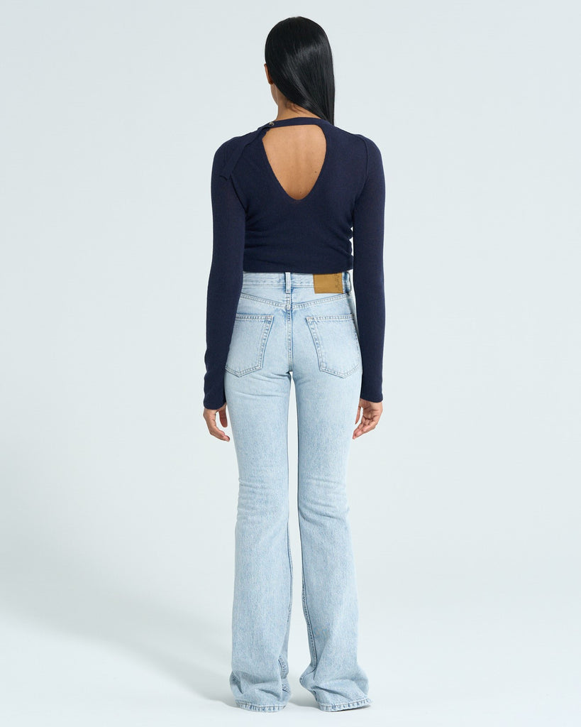 上質なコットンを使用したデニムにバックのロゴ入りパッチがアクセントとなるフレアパンツ。
