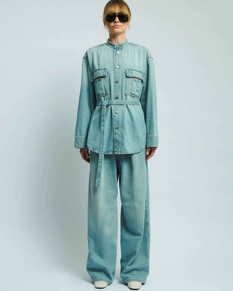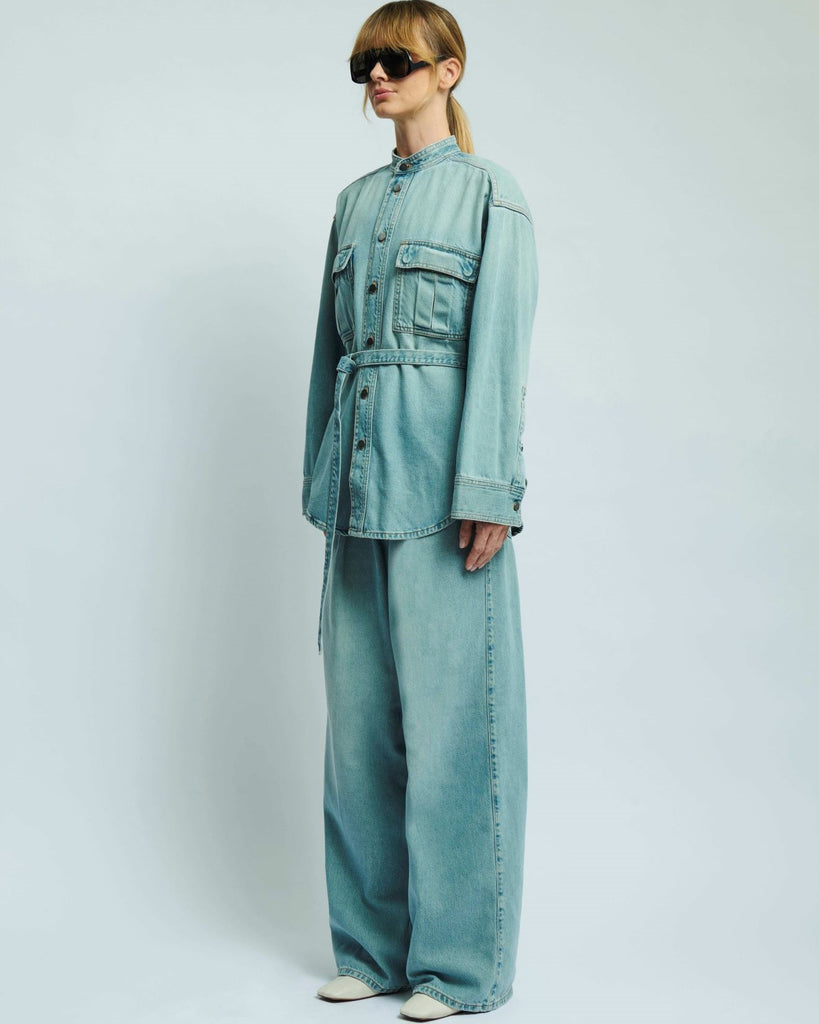 ライトブルーの爽やかなウォッシュ加工が目を引く、デニム素材のジャケットシャツです。スタンドカラーがすっきりとした印象を与え、フロントにあしらわれた複数のフラップポケットが、ワークテイストながらも洗練されたアクセントになっています。