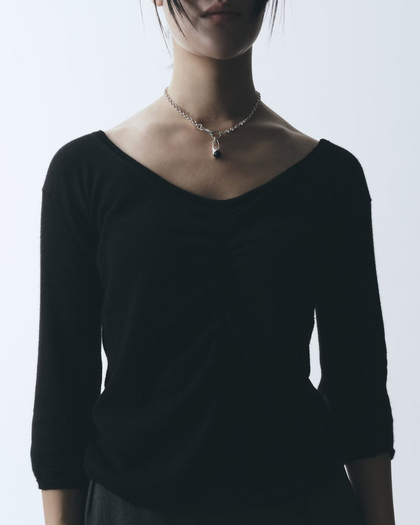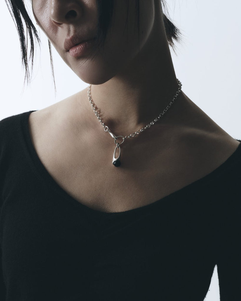 ボリューム感あるSTERLING SILVERのチェーンネックレスとオニキスとの組み合わせは、程よい存在感を放ち、首元をクールでスタイリッシュな印象に。