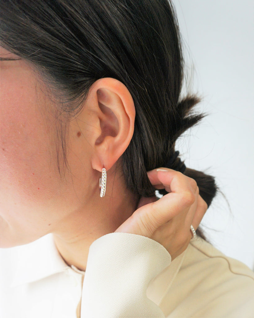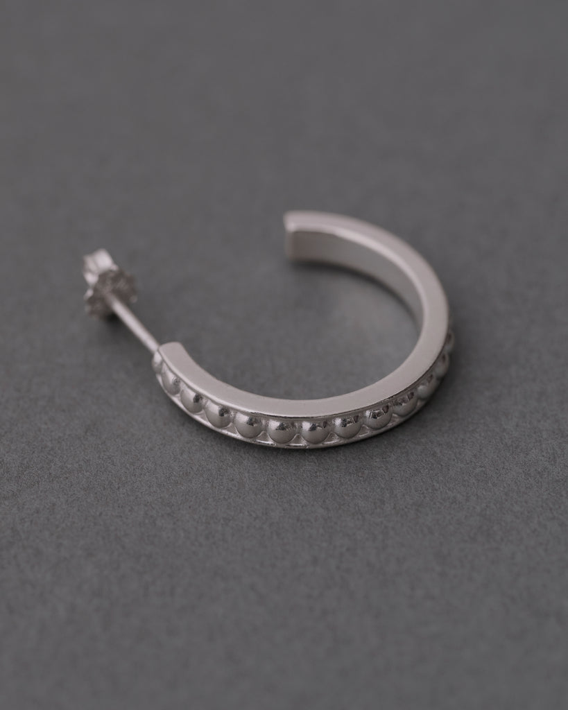 正面に走る細かなドット一列に配したシルバーフープピアス。繊細な粒が光をやさしく散らし、クリーンなラインに上品な表情を添えます。