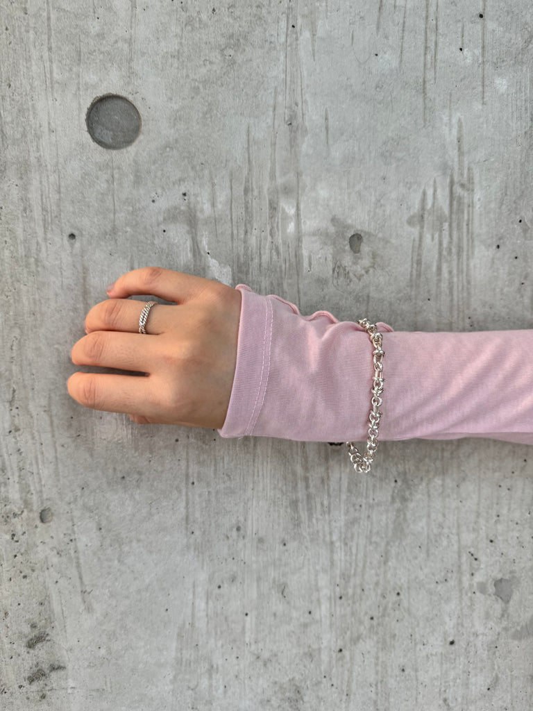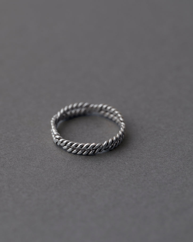 指先にさりげく立体感を。細身のロープチェーンを思わせるツイストを2連で重ねた、シルバー925のミニマルリングです。