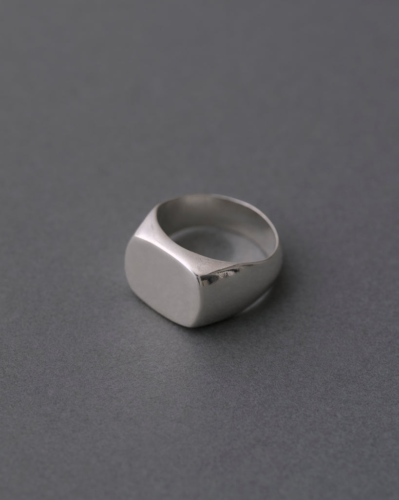 角をやさしく落とした“クッション”シェイプのトップが印象的な、ミニマルなシグネットリング。